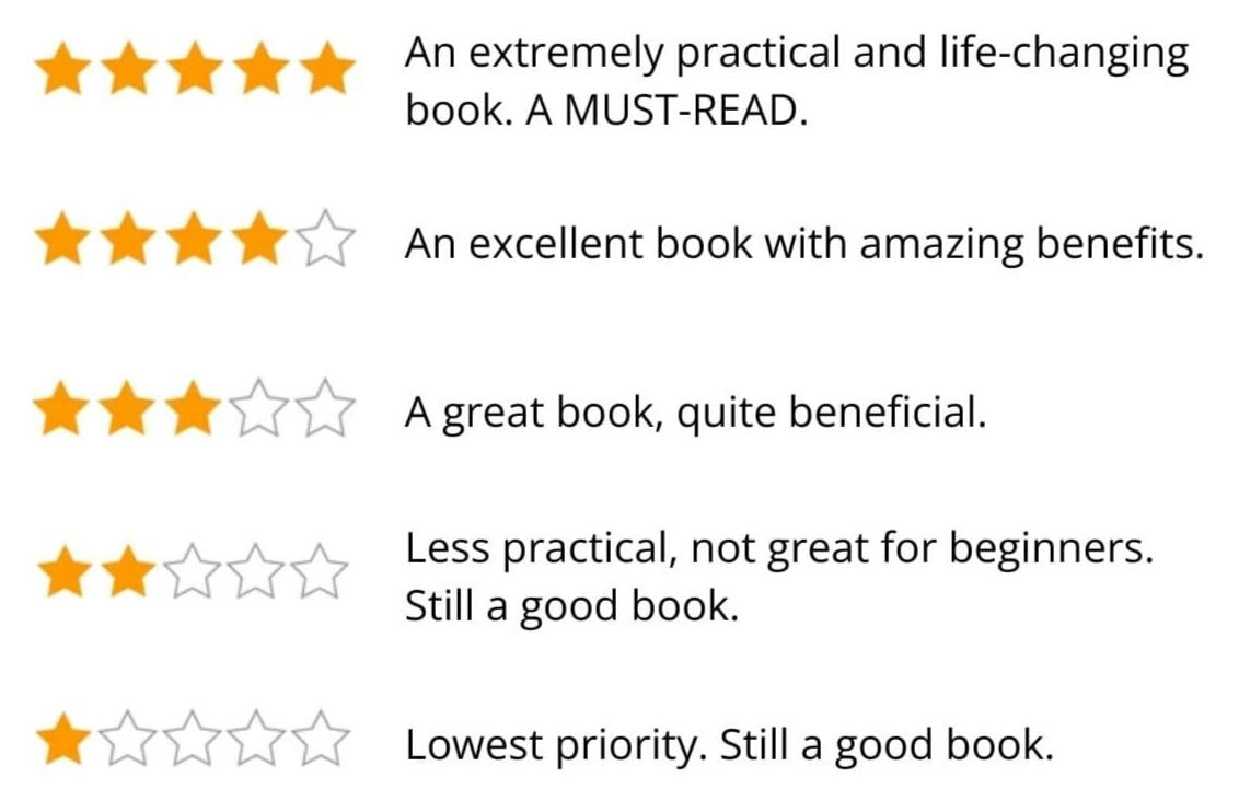 Ratings explained:I've assigned each book on this list a rating from 1-5, and I've roughly ordered them in order of importance.Start with the 5/5 books first. They are the ones that will have the biggest impact on your life. If you only read the 5/5 books, you will have a better understanding of life than 99% of people.The lower-rated books are NOT "bad" books. They are simply less relevant or practical for getting you immediate results in your self-actualization. They might be more philosophical, esoteric, or arcane. Again, they are still amazing books. Just not the highest priority.